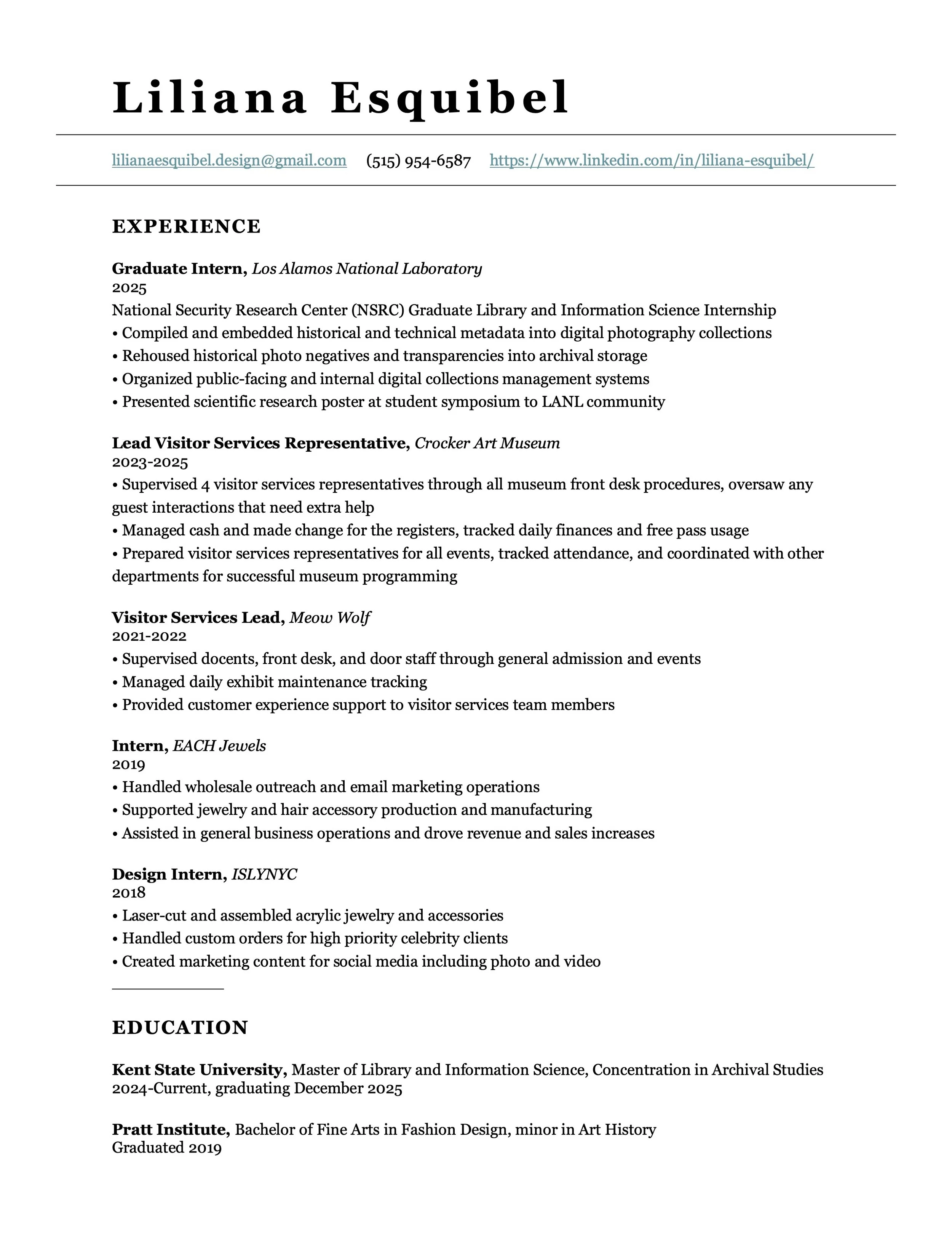 Resume View or download resume as a PDF:Liliana Esquibel ResumeVisit my LinkedIn page:https://www.linkedin.com/in/liliana-esquibel/